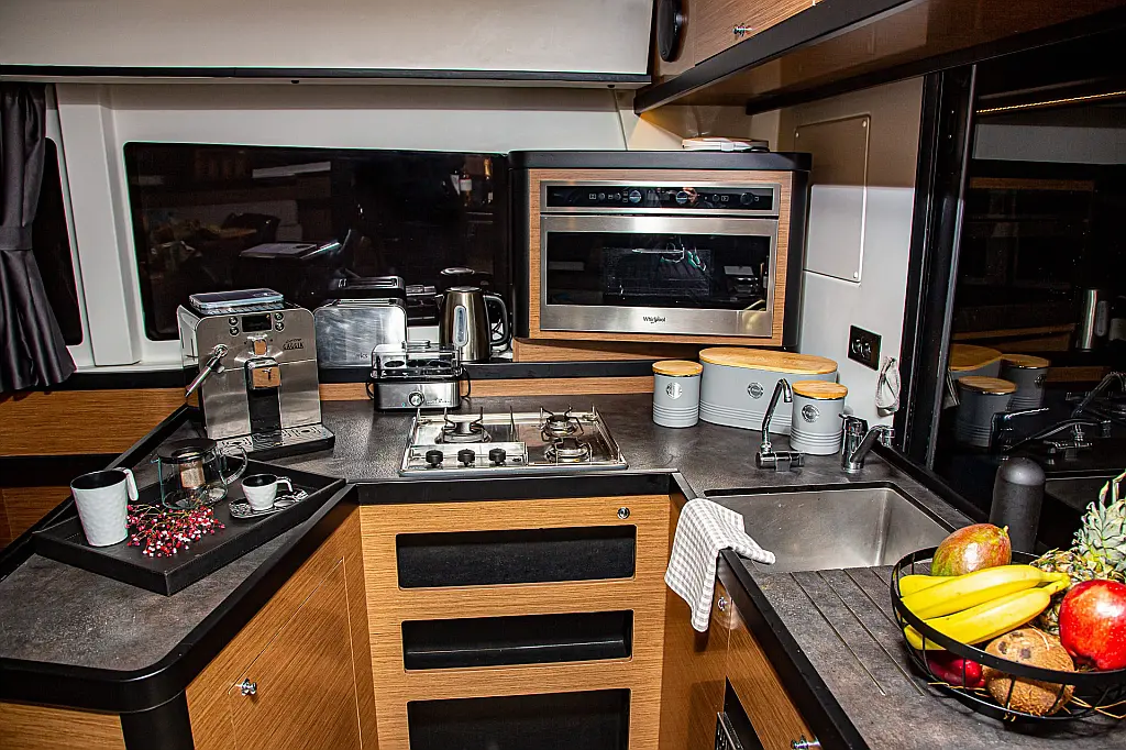 Refrigerator, Air condition, Bimini, Cockpit cushions, Cockpit speakers, Dinghy, Coffee maker, Electric toilet, Generator, Heating, Holding tank, Inverter, Outboard engine, Teak Cockpit, Wi-Fi & Internet